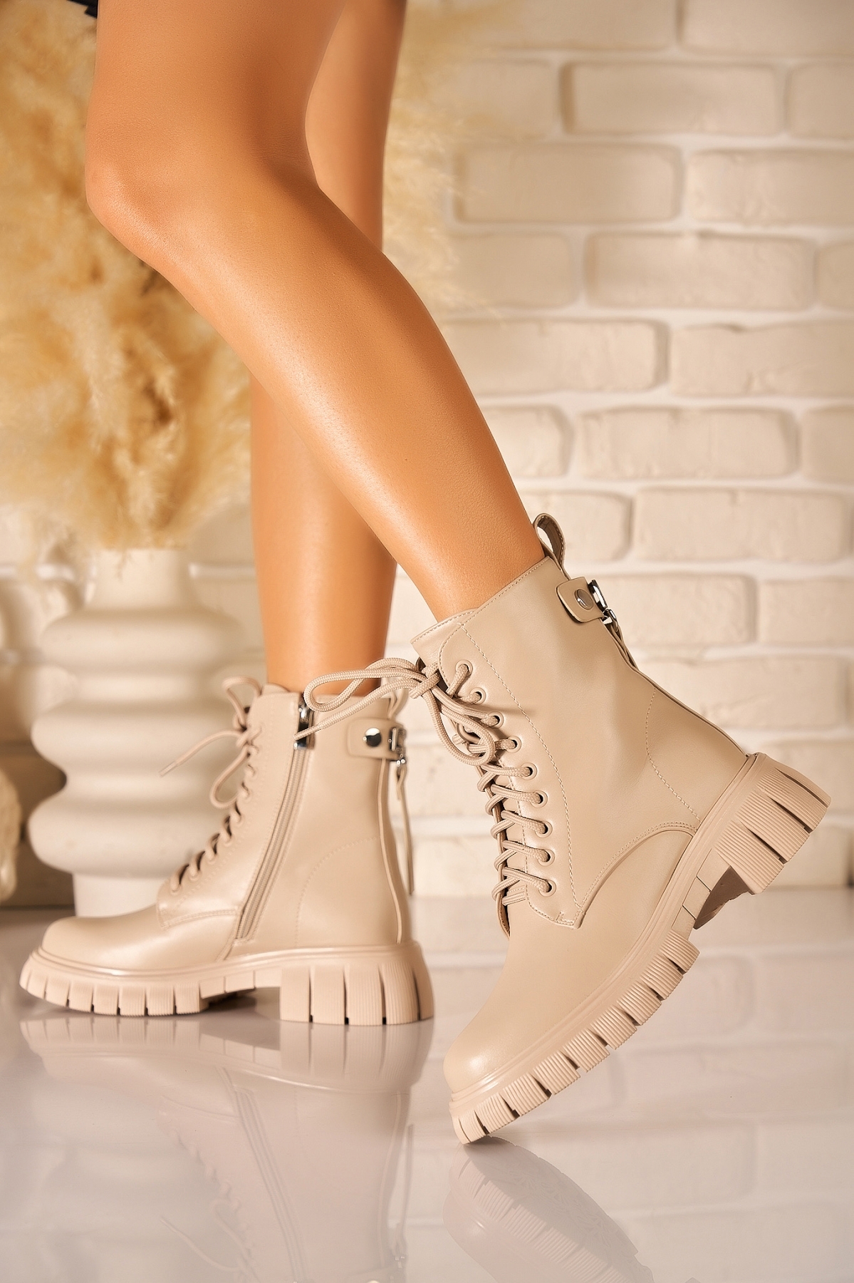Ghete Dama Imblanite Bej din Piele Ecologica Louella